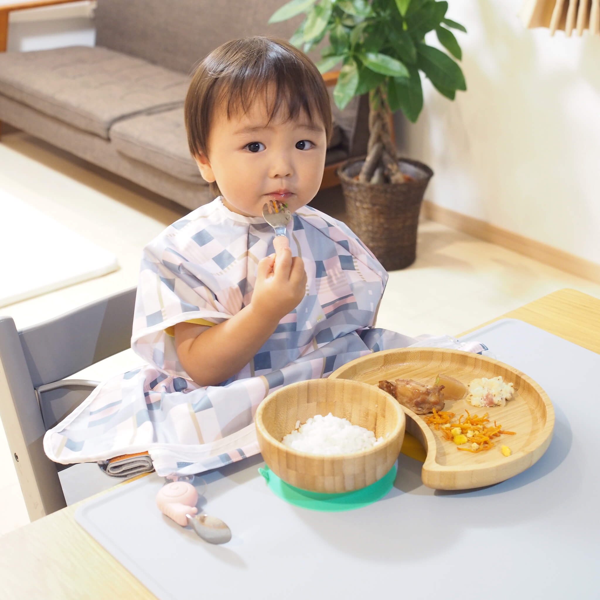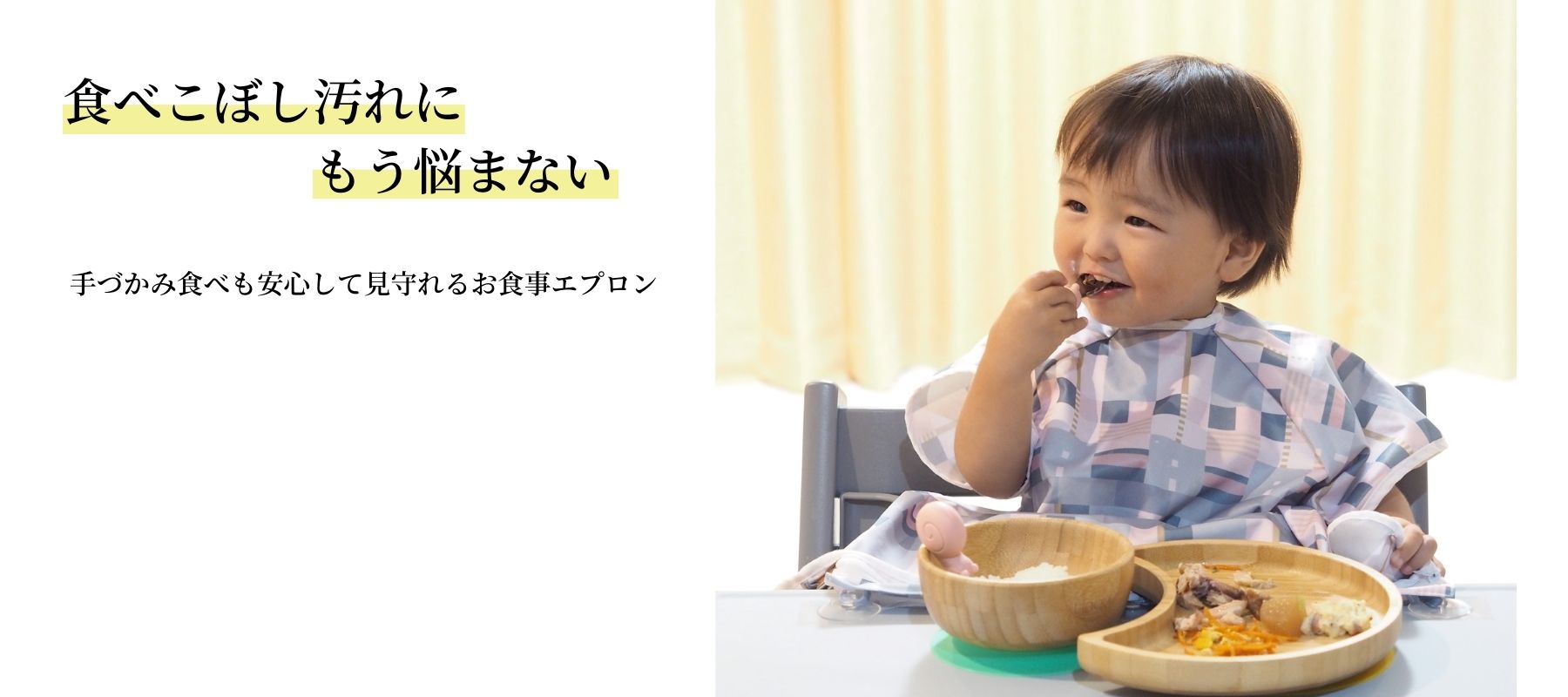 テーブルと椅子の間をエプロンの裾で覆うことで食べこぼしをキャッチ。ハイチェアでもダイニングでも使える2way仕様。